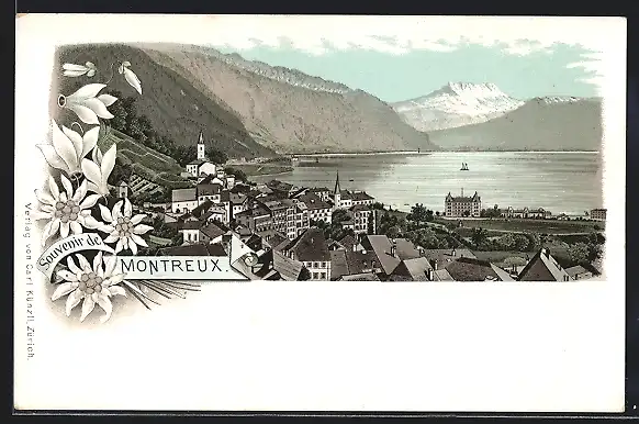 Lithographie Montreux, Totalansicht aus der Vogelschau
