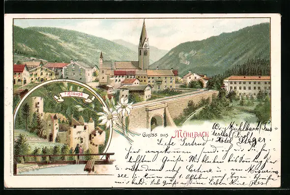 Lithographie Mühlbach, Ortsansicht mit Klause
