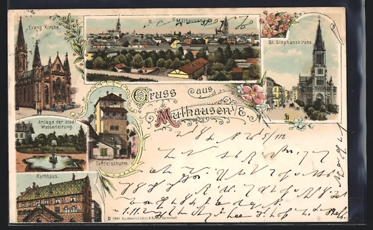 Lithographie Mülhausen i. E., Evang. Kirche, Rathhaus, St. Stephanskirche