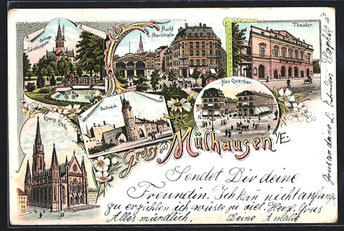 Lithographie Mülhausen i. E., Theater, Markthalle und Kirche