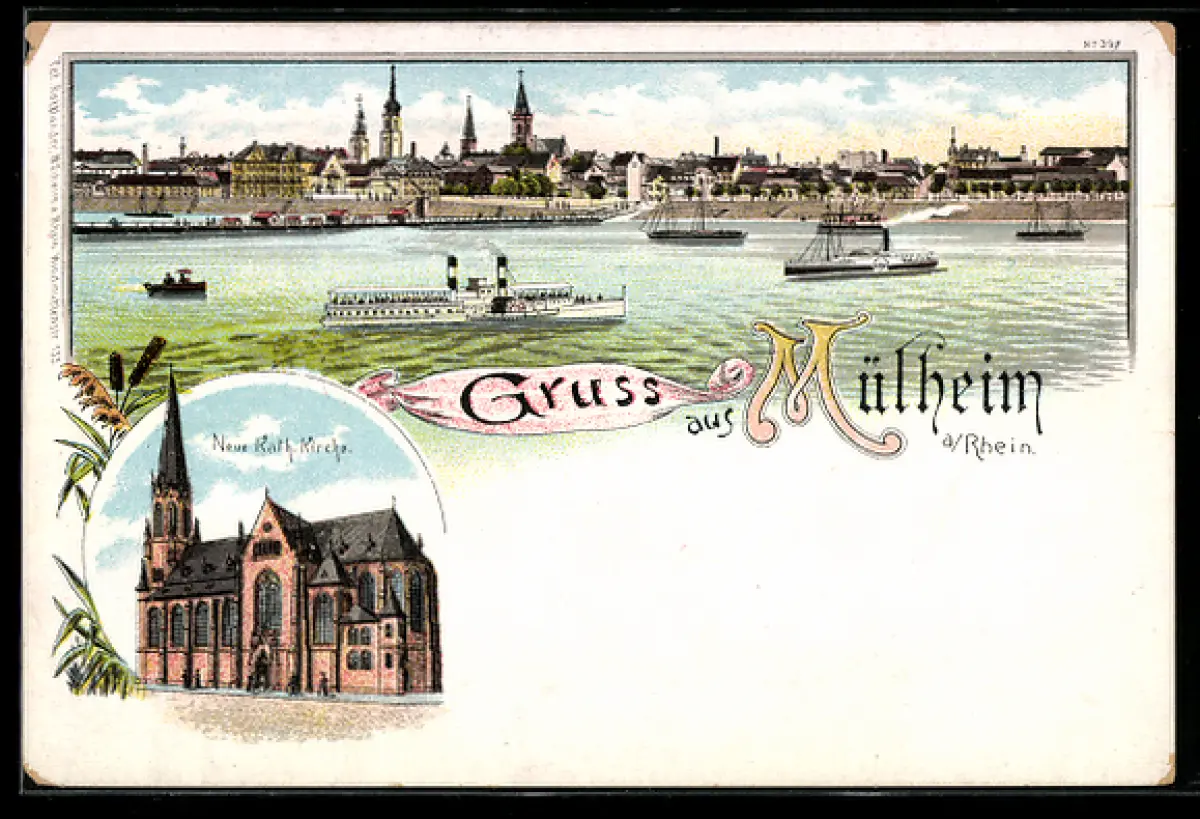 Lithographie Mülheim / Rhein, Dampfer vor dem Ort, Rheinfischer