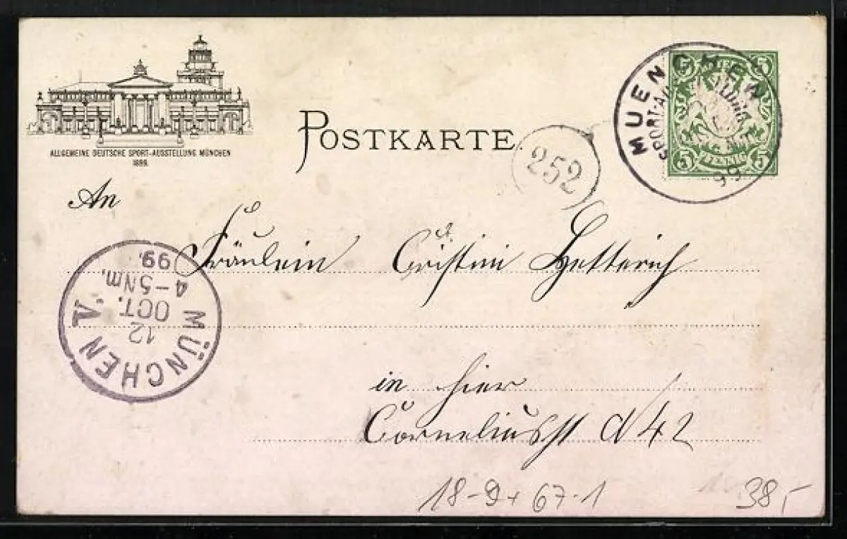 Lithographie München, Allgemeine Deutsche Sport-Ausstellung 1899, Törn mit dem Segelboot, Ganzsache Bayern