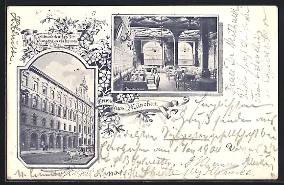Lithographie München-Au, Restaurant des Kunstgewerbehauses mit Innenansicht, Pfandhausstrasse