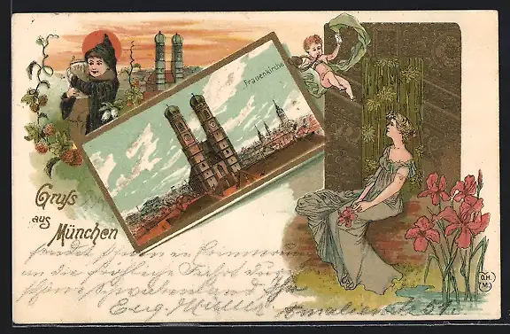 Lithographie München, Frauenkirche, Münchner Kindl mit einem Bierkrug, Engel schwebt über einer Frau, Jugendstil