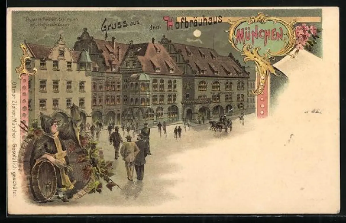 Lithographie München, Gäste vor dem Münchner Hofbräuhaus
