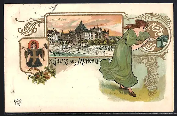 Lithographie München, Münchner Kindl, Justiz-Palast, Frau wirft Brief in den Kasten