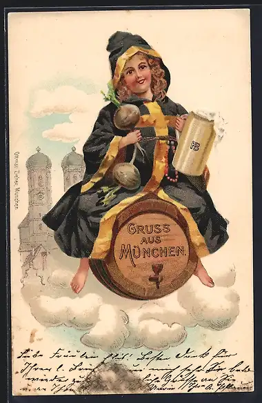 Lithographie München, Münchner Kindl fliegt auf einem Bierfass, Im Hintergrund Frauenkirche