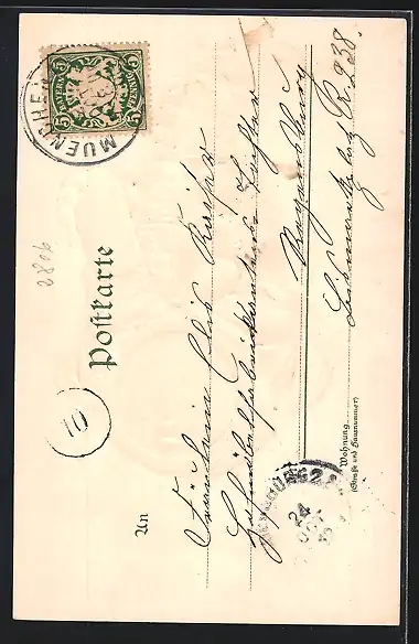 Personenbezogene Daten auf der Rückseite der Karte wurden durch blauen Textmarker unkenntlich gemacht. Die blauen Stellen sind auf die Vorderseite durchgeweicht und wirken sich negativ auf das Postkartenfoto aus