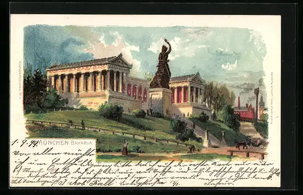 Lithographie München, Partie an der Bavaria und Ruhmeshalle