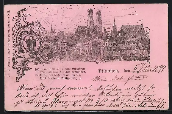 Lithographie München, Teilansicht mit Frauenkirche, Private Stadtpost