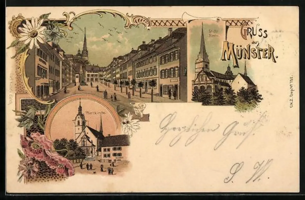 Lithographie Münster /LU, Stiftskirche, Pfarrkirche und Ortspartie