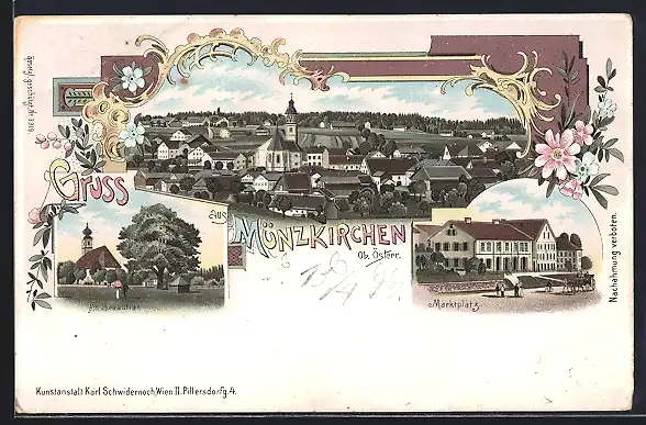 Lithographie Münzkirchen, Marktplatz, St. Sebastian, Ortsansicht