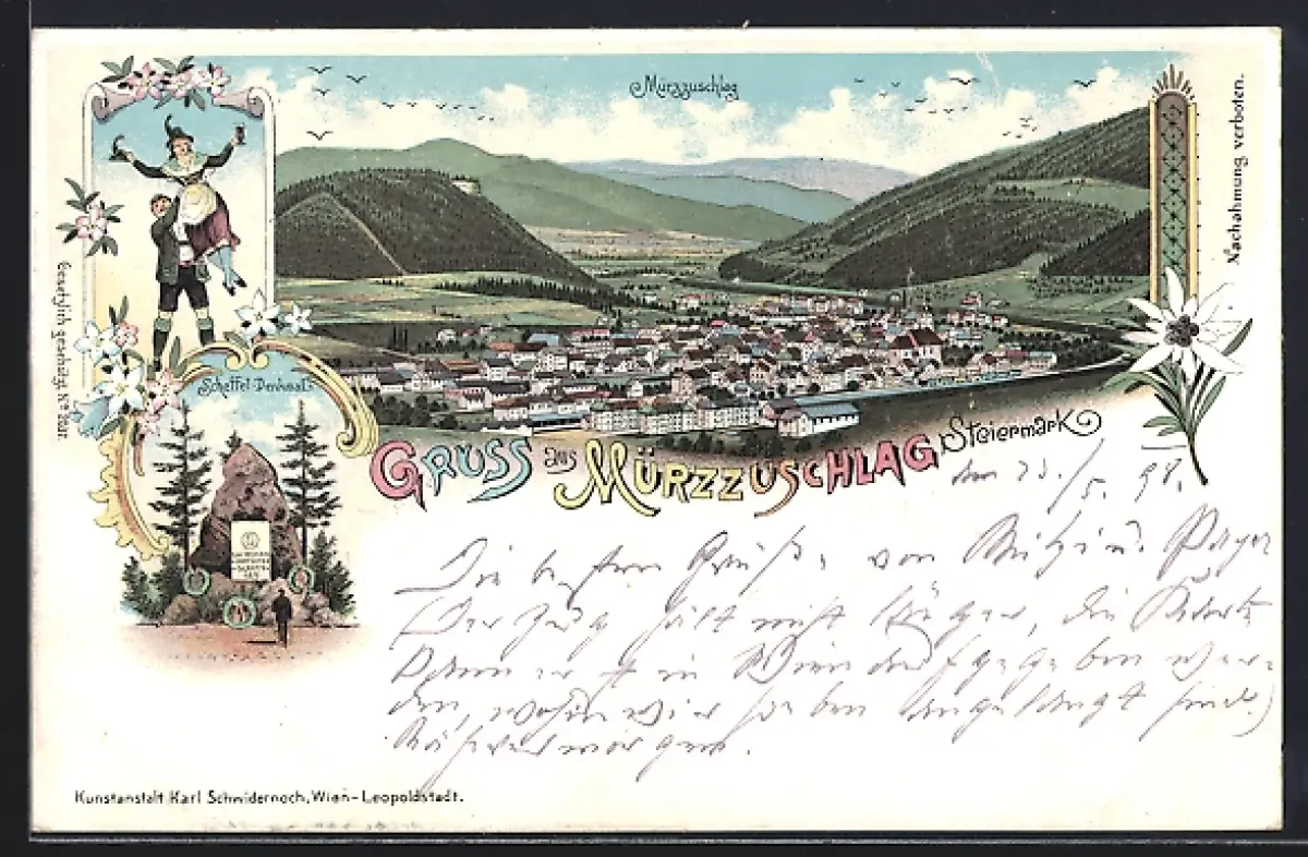 Lithographie Mürzzuschlag, Scheffel Denkmal, Gesamtansicht, Mann u. Frau in Tracht