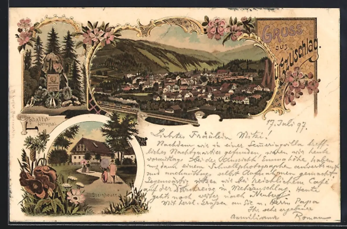 Lithographie Mürzzuschlag, Totalansicht, Scheffel-Denkmal, Steinbauer