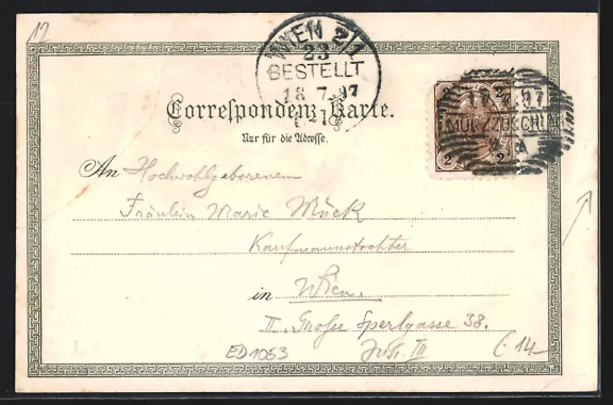 gelaufen 1897, Eckknick re. oben, Bugspuren re. mittig, guter Zustand