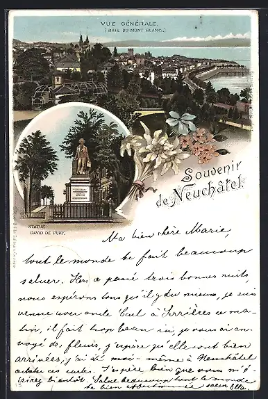 Lithographie Neuchâtel, Statue David de Pury, Vue Générale