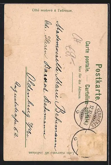 Personenbezogene Daten auf der Rückseite der Karte wurden durch blauen Textmarker unkenntlich gemacht. Die blauen Stellen sind auf die Vorderseite durchgeweicht und wirken sich negativ auf das Postkartenfoto aus