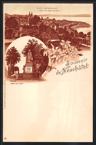 Lithographie Neuchâtel, Statue David de Pury, Vue générale