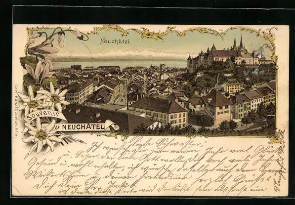 Lithographie Neuchatel, Totalansicht aus der Vogelschau