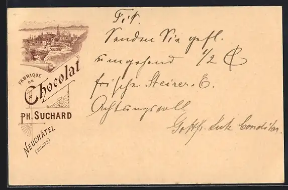 Lithographie Neuchatel, Vue Générale, Fabrique de Chocolat Ph. Suchard