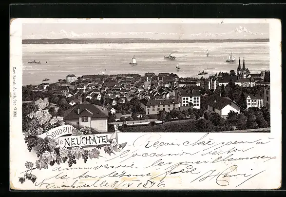 Lithographie Neuchâtel, Vue générale, Dampfer, Segelboote