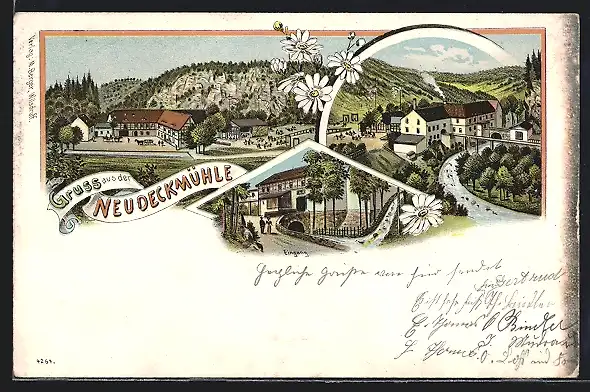 Lithographie Neudeckmühle, Totalansicht, Gasthaus, Eingang