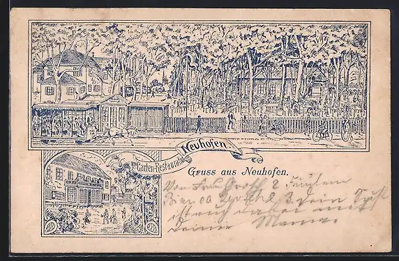 Lithographie Neuhofen, Garten-Restaurant Neuhofen, Vorderansicht, Panorama mit Garten