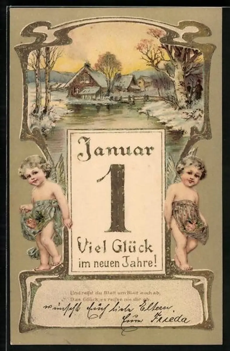 Lithographie Neujahrsengel mit dem ersten Kalenderblatt, Neujahr