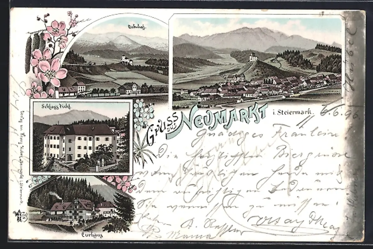 Lithographie Neumarkt i. Steiermark, Curhaus, Schloss Pichl, Bahnhof