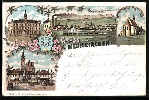 Lithographie Neunkirchen, Türkensturz, Rathaus, Peters-Kirche, Hauptplatz