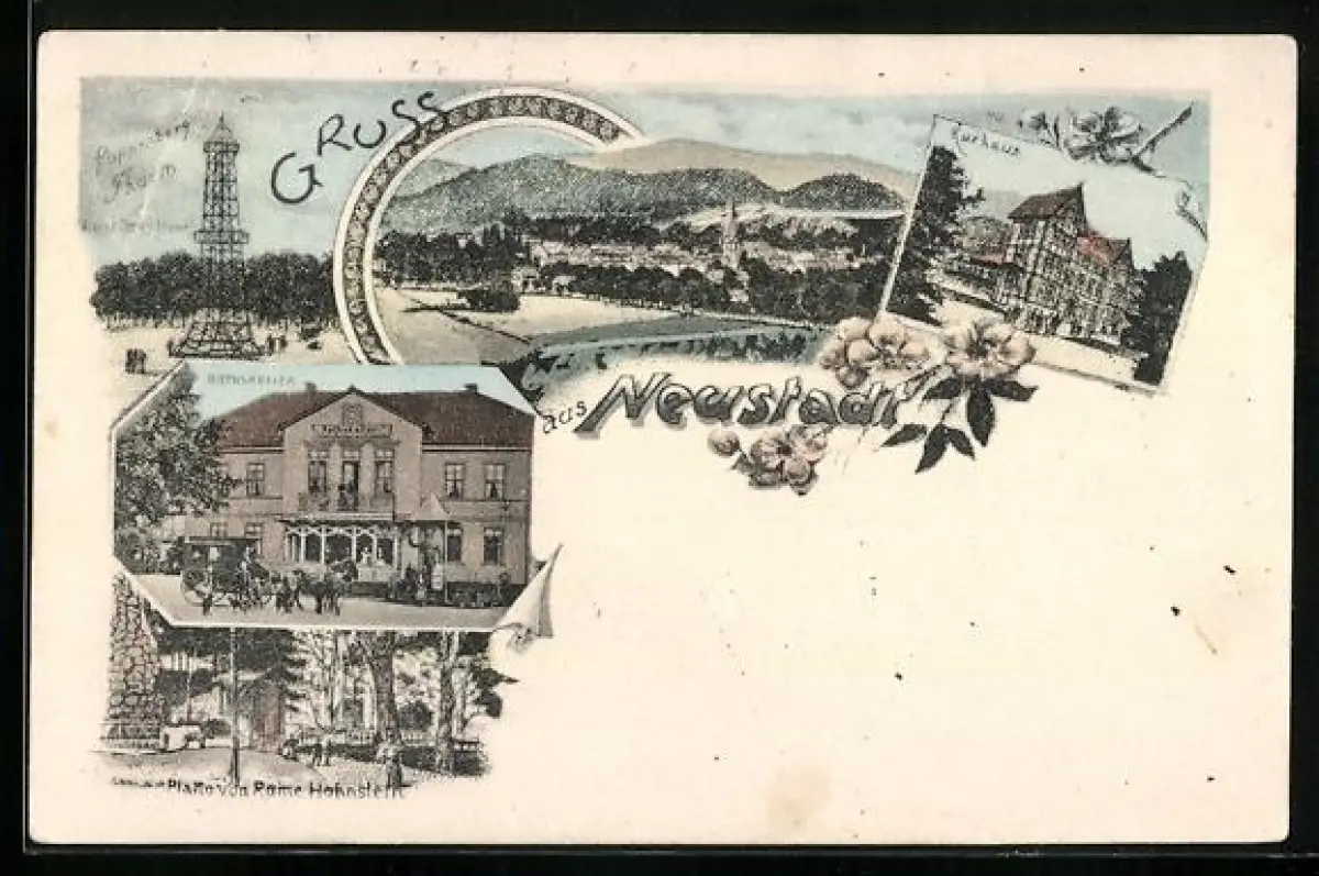 Lithographie Neustadt /Ilfeld, Restaurant Ratskeller, Poppenberg-Turm, Kurhaus