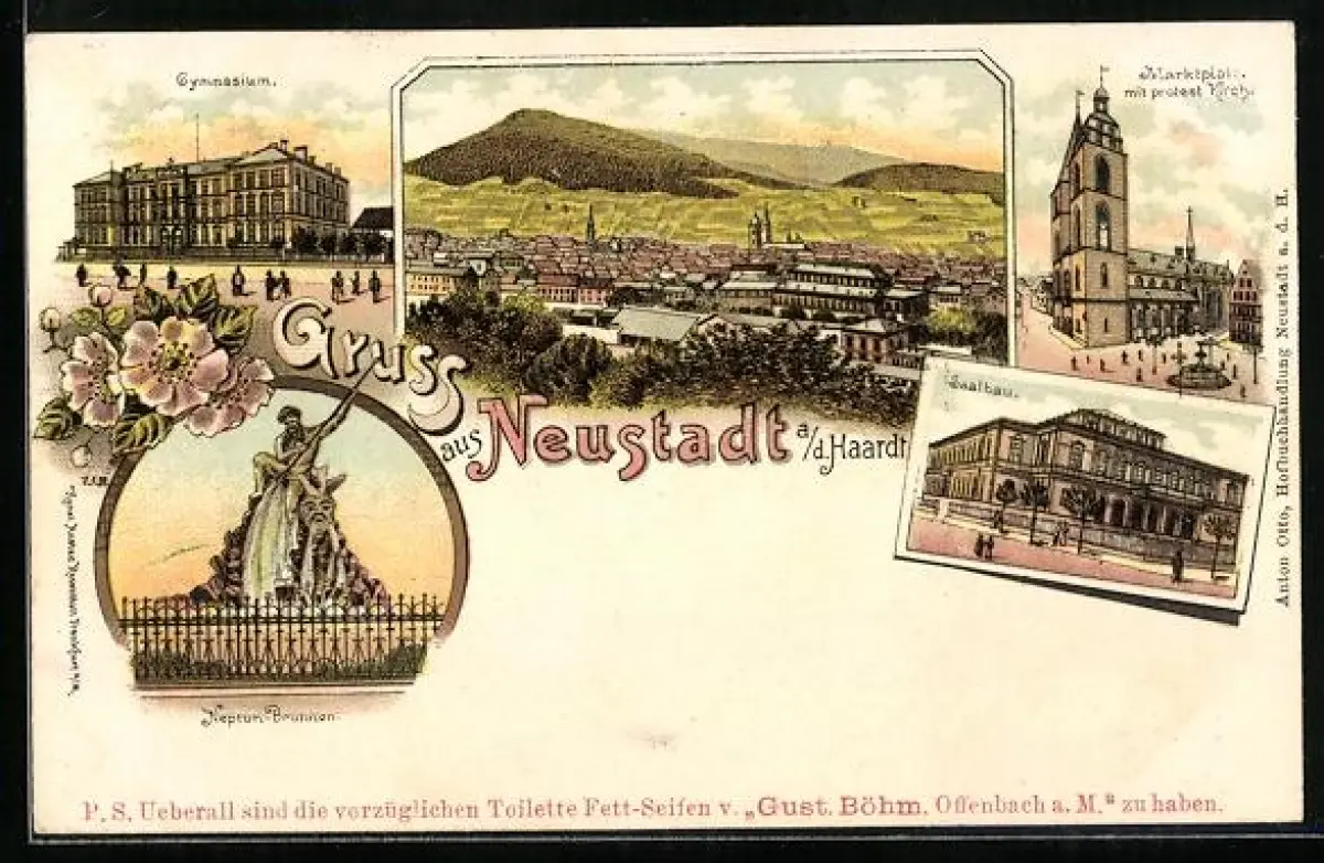 Lithographie Neustadt a. d. Haardt, Marktplatz mit protest. Kirche, Saalbau, Neptun-Brunnen, Gymnasium, Ortsansicht