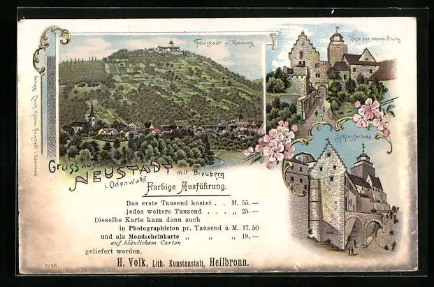 Lithographie Neustadt i. Odenwald, Ansicht mit Breuberg, Tor der oberen Burg, Schlossbrücke