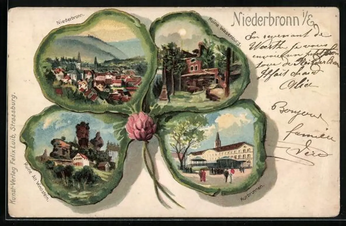 Lithographie Niederbronn i. E., Ruine Wasenburg, Kurbrunnen, Ruine Alt Windstein