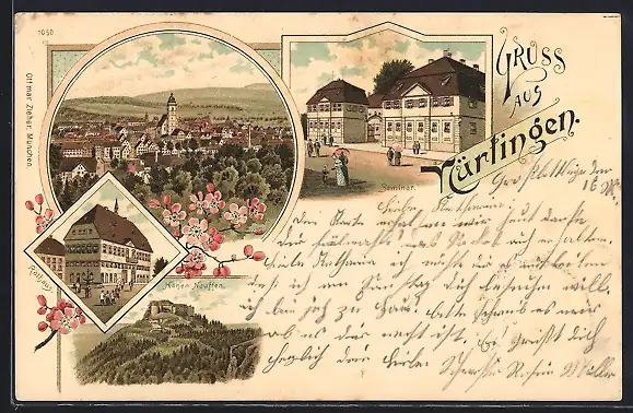 Lithographie Nürtingen, Rathaus, Seminar, Hohen Neuffen