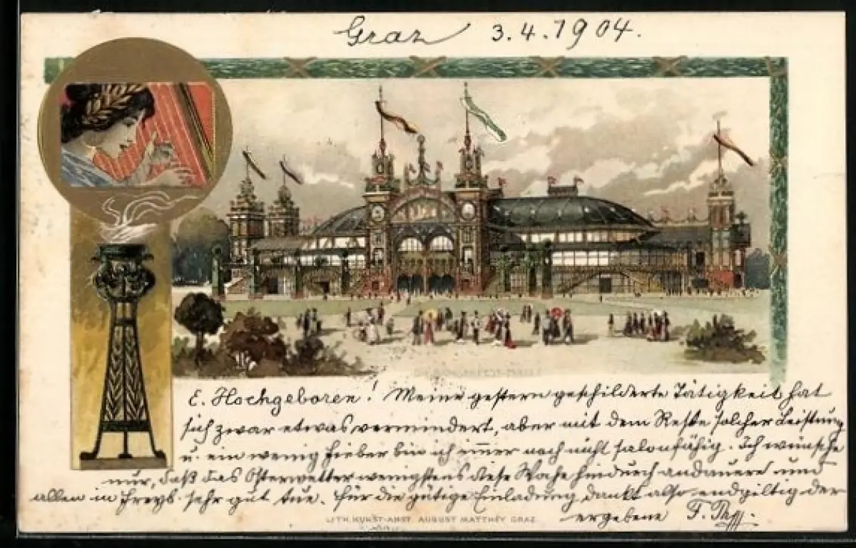 Lithographie Österreich, die festlich geschmückte Sängerfest-Halle, Harfenspielerin und eine ewige Flamme