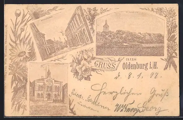 Lithographie Oldenburg i. H., Schuhstrasse mit Gebäudeansicht, Rathaus, Totalansicht