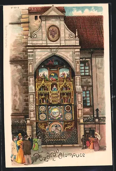 Lithographie Olmütz / Olomouce, Schaulustige bei der Astronomischen Uhr