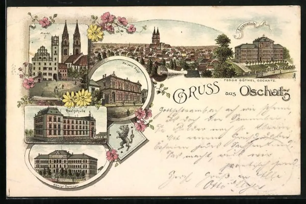 Lithographie Oschatz, Kaiserliche Post, Realschule, Königl. Seminar, Markt, Bürgerschule