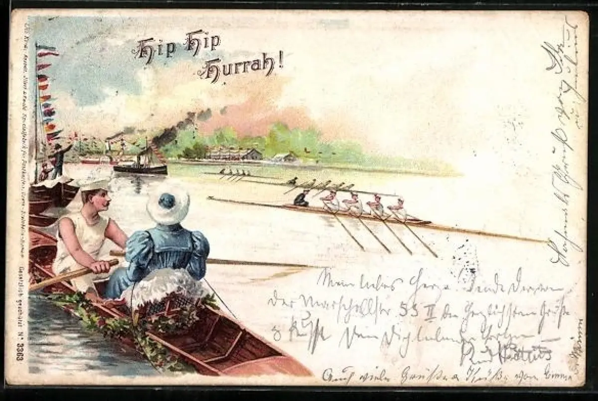 Lithographie Paar in einem Ruderboot sieht eine Rudermannschaft