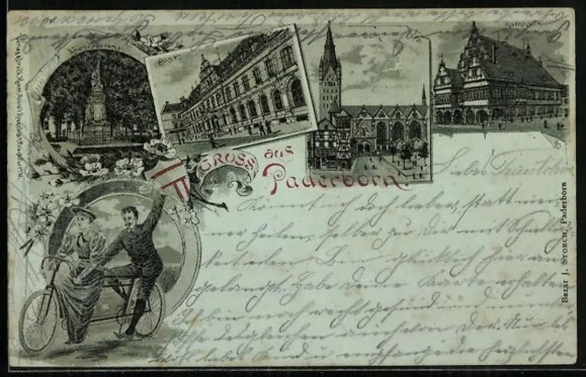 Lithographie Paderborn, Post, Dom, Rathaus