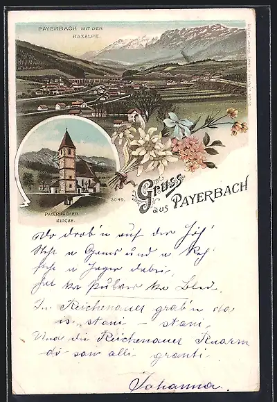 Lithographie Payerbach, Ansicht mit der Raxalpe und Payerbacher Kirche