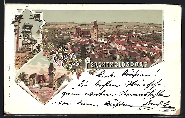 Lithographie Perchtoldsdorf, Marktplatz mit Kirche, Turm u. Mariensäule, Ortsansicht aus der Vogelschau