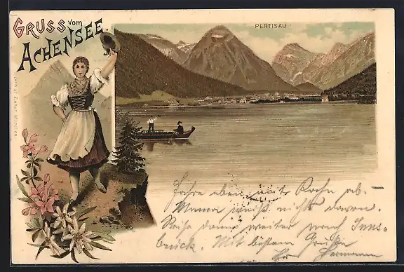 Lithographie Pertisau, Ansicht am Achensee und Frau in Tracht