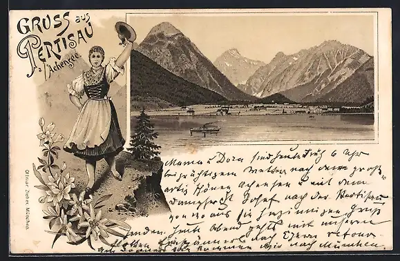 Lithographie Pertisau a. Achensee, Panorama mit See und Gebirge, Österreicherin in Tracht