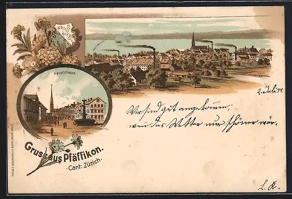Lithographie Pfäffikon /Zürich, Hauptstrasse und Teilansicht