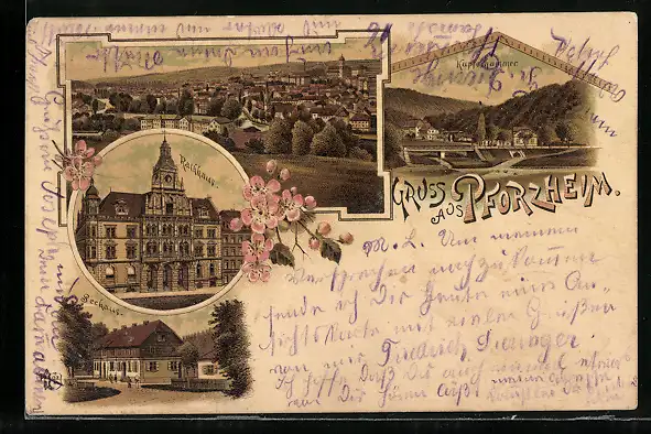 Lithographie Pforzheim, Kupferhammer, Rathaus, Seehaus