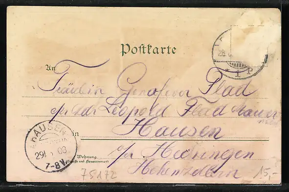 gelaufen 1903, Briefmarke entfernt, rückseitig Oberflächenschaden, Eckknick re. oben, guter Zustand