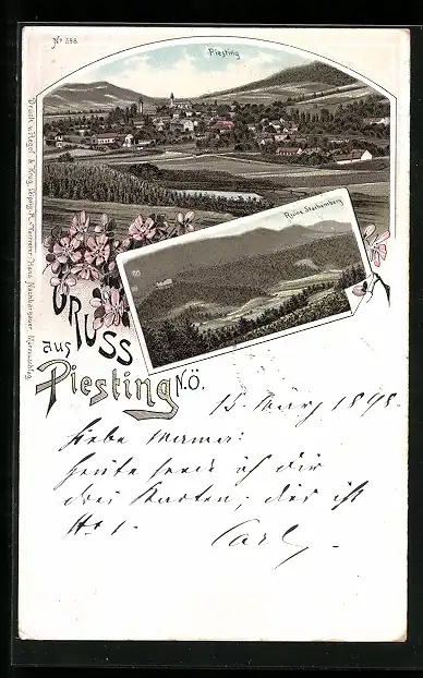 Lithographie Piesting, Ortsansicht mit Ruine Starhemberg