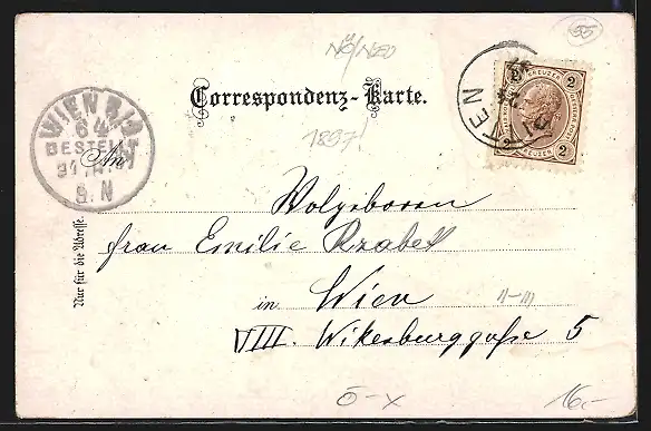 gelaufen 1897, Klebe- u. Papierreste li. unten, guter Zustand